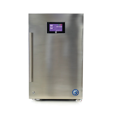 The Cool Cure C2 features a durable stainless-steel exterior finish and is equipped with WIFI for connectivity and a compatible smartphone app for ease of use. It has a convenient 1-liter front access water tray and an interior made of 100% food-grade ABS. The food-grade shelves are also stainless steel, ensuring safety and quality. A vibrant touchscreen enables quick control of your dry, cure, and store cycles, while user controlled multi-color internal LED lighting enhances visibility.