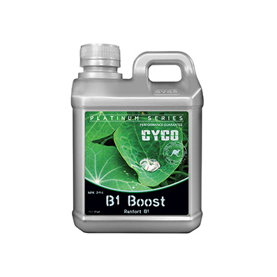 Cyco™ Platinum Series B1 Boost 2-1-4 is an additive used throughout the vegetative and flowering periods of plant growth. Used at higher concentrations in vegetative growth than flowering, B1 Boost contains high amounts of the natural vitamin B1, also known as thiamine. Thiamine is a natural hormone that is present in the plant, natural bacteria excrements and native fungi. By providing a constant presence of thiamine, root growth is encouraged, thereby allowing for healthy new growth. B1 Boost is also a strong source of pharmaceutical-grade potassium. A necessary ingredient to plant growth enzymes, protein formation and the translocation of sugars, potassium in B1 Boost allows for vibrant, healthy growth.