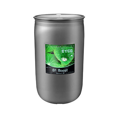 Cyco Platinum Series B1 Boost is an additive used throughout the vegetative and flowering periods of plant growth. Used at higher concentrations in vegetative growth than flowering, B1 Boost contains high amounts of the natural vitamin B1, also known as thiamine. Thiamine is a natural hormone that is present in the plant, natural bacteria excrements and native fungi. By providing a constant presence of thiamine, root growth is encouraged, thereby allowing for healthy new growth. B1 Boost is also a strong source of pharmaceutical-grade potassium. A necessary ingredient to plant growth enzymes, protein formation and the translocation of sugars, potassium in B1 Boost allows for vibrant, healthy growth.