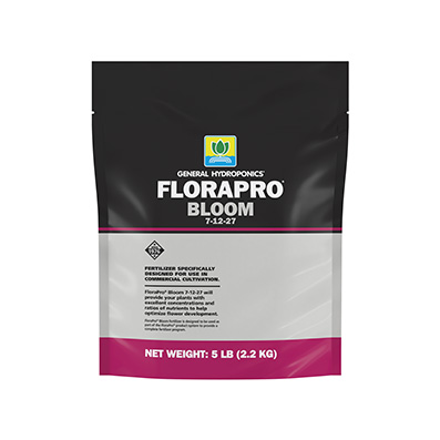 Specifically designed for use in commercial cultivation. FloraPro® Bloom 7-12-27 will provide your plants with excellent concentrations and ratios of nutrients to help optimize flower development. FloraPro® Bloom fertilizer is designed to be used as part of the FloraPro® product system to provide a complete fertilizer program.