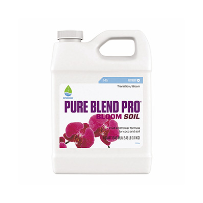 A premium, one-part plant food for use in many types of growing techniques such as hydroponics, soil and soilless applications. Pure Blend® Pro Soil is used in the fruiting & glowering stage to support vigorous leaf and stem formation. It is formulated to be used in soils that have microbes and colloidal particles that tend to bind phosphorus by supplying higher than typical amounts of that element.