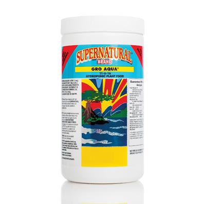 Supernatural Brand® Gro Aqua® 11-6-16 powdered nutrients enhance hydroponic plant growth by providing essential macro and micro elements for healthy development during the vegetative stage.
