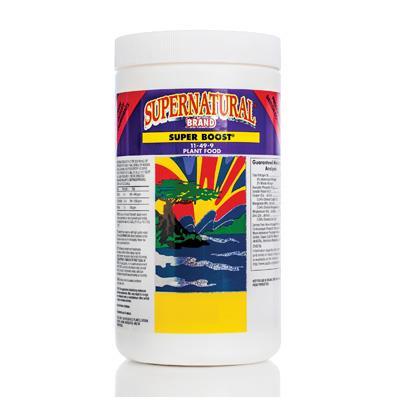Supernatural Brand® Super Boost® 11-49-9 enhances root development, early to late flowering, and ripening in soil, soilless, and terraponic mediums. Its premium ingredients are essential for optimal plant growth.