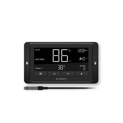 The AC Infinity CONTROLLER 67 is a digital controller designed to enhance your AC Infinity fan with smart controls to maintain a stable climate. This intelligent command unit features a black powder-coated body and a backlit LCD screen that presents a sleek aesthetic. The display has three brightness levels, as well as two auto brightness settings, and reads temperatures in Fahrenheit or Celsius. It includes a 12-foot sensor probe with a waterproof thermalloy head that accurately detects current temperature and humidity conditions. The controller’s 4-pin Molex fan ports can simultaneously power two fans to share the same fan speed and programming. Functions include automated triggers, timers, on/off cycling, and scheduling.