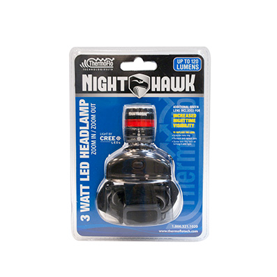 The ThermoFlo™ Nighthawk White Light LED headlamp is perfect for those who work in dimly-lit or dark spaces. This versatile three-watt light offers zoom functionality and features three settings: high, low, and flash. It comes with a green lens for enhanced depth perception (exclusive to the white light model). Crafted from waterproof materials, it boasts an impressive 20 lumens output power. The Nighthawk is perfect for working long hours, lasting 4-5 hours on high and up to 30 hours when set to low.