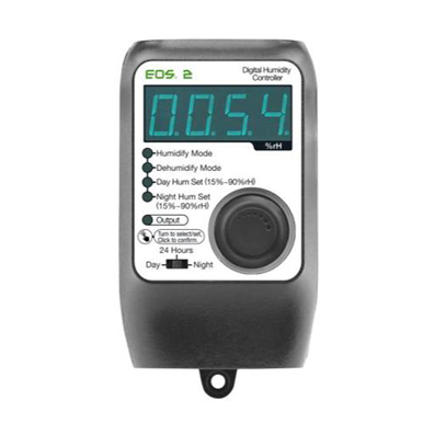 The Eos® 2 Digital Humidity Controller makes dialing in your room's environment a breeze. It can be used to activate a device to increase humidity in your room or decrease the humidity in your room. The Eos® 2 utilizes a high-quality humidity sensor as well as a photocell for day and night control. Settings are easily programmed with the knob that doubles as a button to change settings. A slide switch controls whether the controller is running in Day, Night or 24 hr mode. 10 Amps/ 120 V/ 60 Hz.