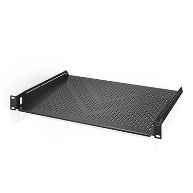The AC Infinity Vented Cantilever Rack Shelf is designed for supporting non-rack mountable equipment such as tower computers, routers, UPS systems, and monitors. Fits into all standard 19 inch racks and cabinets, and takes 1U or 1RU of space. Vent design maximizes airflow and prevents hot spots, while maintaining structural integrity. Constructed of heavy-duty 2.4mm thick cold rolled steel with a black powder coated finish. With a dual flange design, the shelf has a weight capacity of 60 lbs. Internal usable width is 43.7 cm, usable depth is 35.3 cm, usable height is 3.8 cm, with a 7 mm downward lip. Includes four pieces of 10-32 screws, four plastic washers, and four cage nuts.