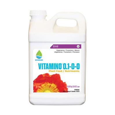 Botanicare® developed Vitamino® to preserve balanced plant growth and optimal plant health in accelerated growth environments. Vitamino uses high-impact supplements including select vitamins and all 20 essential amino acids to act either directly or as cofactors for enzymes that trigger biochemical pathways commonly used in plant tissue culture and lead to synthesis of essential macro molecules. Vitamino can be used at any time with any regimen throughout the grow and bloom stages.